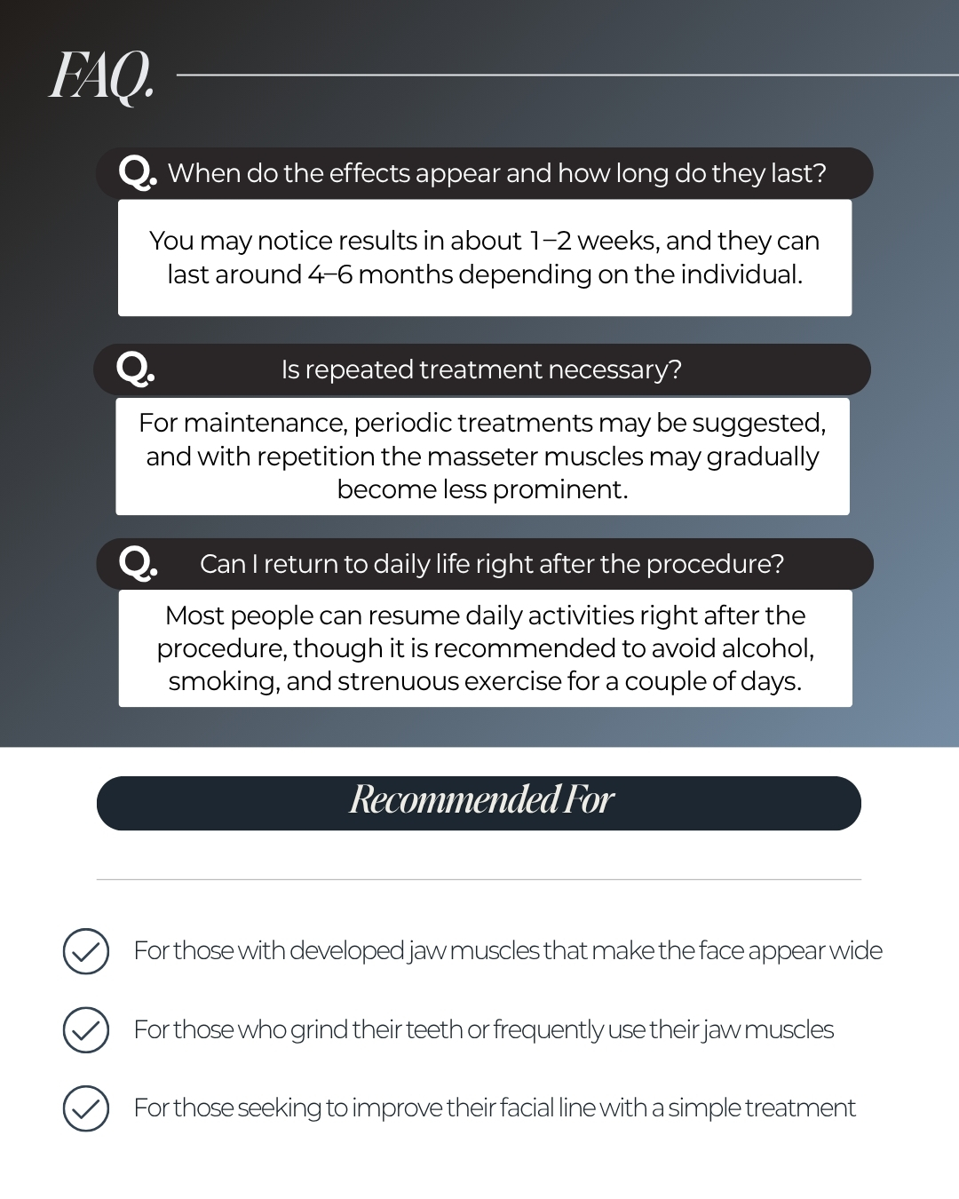 With repeated treatments, the masseter muscles may gradually shrink, leading to longer-lasting results.